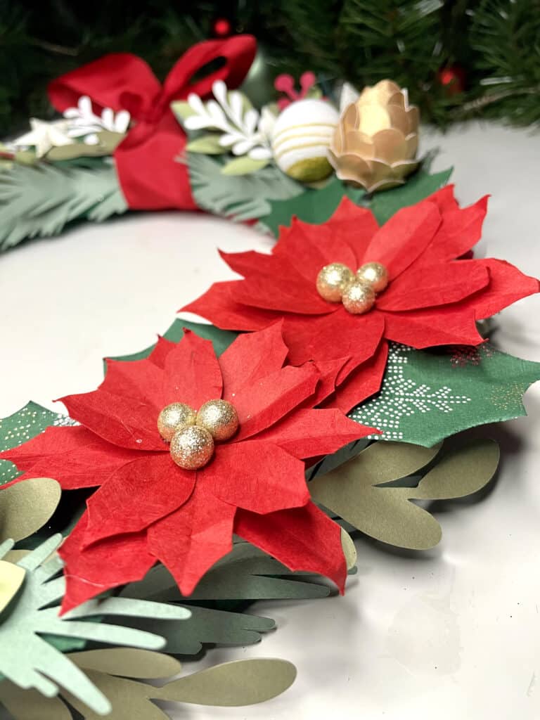 5- Coller les fleurs sur la couronne et y ajouter des perles dorées au centre.