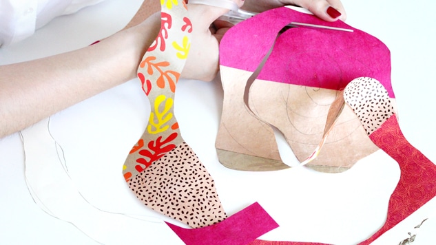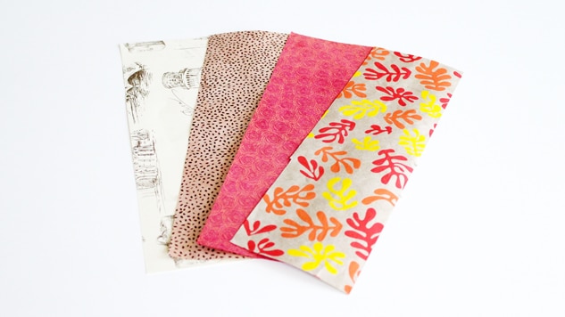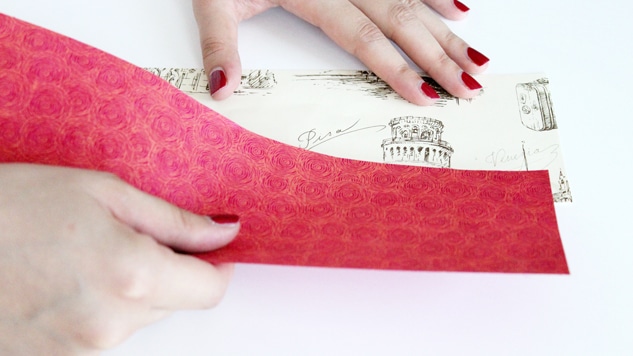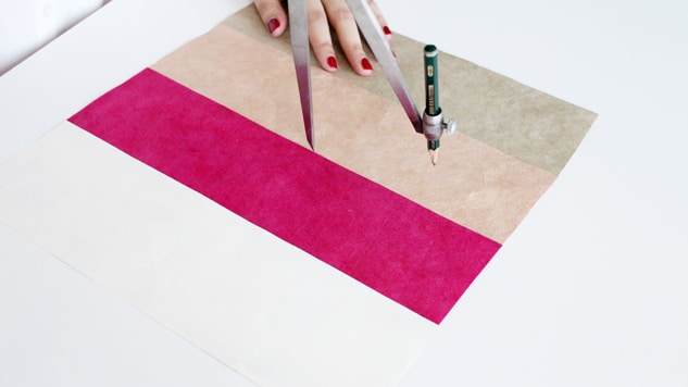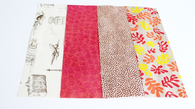 Découpez au cutter 3 bandes de 8,25 x 29 cm et 1 bande de 7,25 x 29 cm dans des papiers différents.