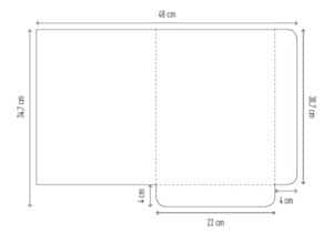Découpez un rectangle de 48cm x 34,7cm dans votre assemblage de papier. Puis découpez les rabats sur deux des côtés (voir le schéma), ici on a choisi de créer des rabats de 4 cm. Vous obtenez un rabat de 30,7 x 4 cm (voir le schéma) et un autre rabat de 22 x 4 cm.