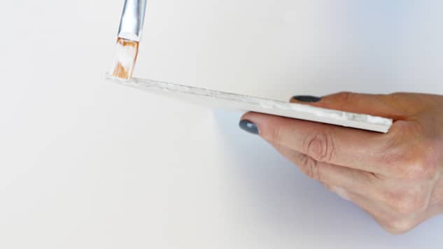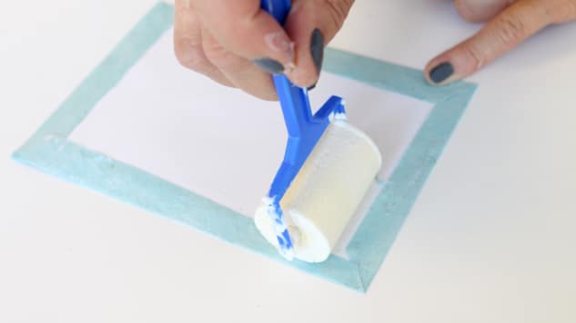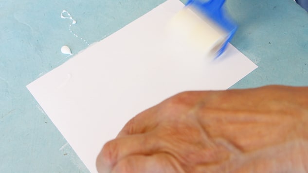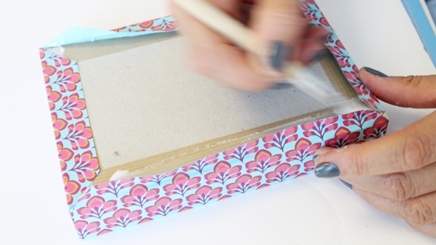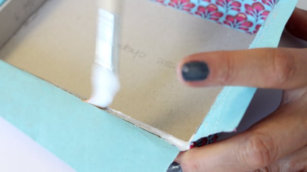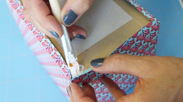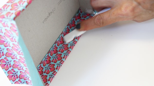 Encollez le fond intérieur de la boîte avec un rouleau mousse et de la flexicolle. Faites glisser délictament votre Rigidex recouvert de papier vers le fond de la boîte et lissez bien. Encollez les marges du papier sur les côtés de la boîte avec un pinceau.