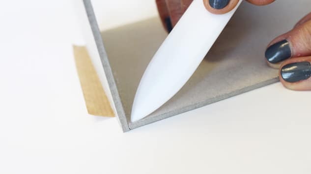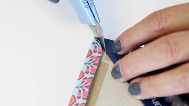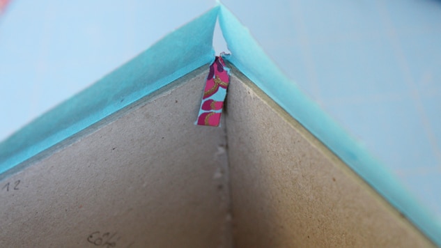 Pour rabattre la marge du papier vers l’intérieur de la boîte, pincez l’angle et coupez-le en appuyant la lame du cutter le long du carton, comme sur les images ci-dessus. Faites de même des deux côtés de l’épaisseur du carton. Vous obtenez une petite bande, ne la coupez surtout, elle va nous permettre de dissimuler le carton dans les angles. Répétez l’opération sur les 4 coins. Collez les petites bandes puis les marges. Utilisez l’encoche du plioir pour bien marquer les arrêtes.