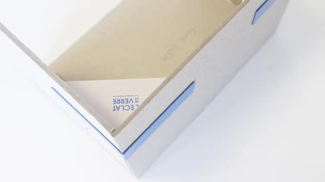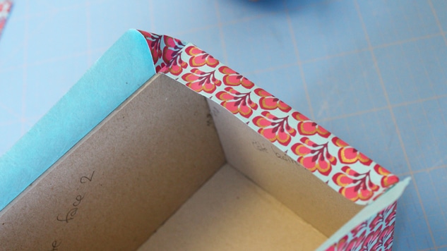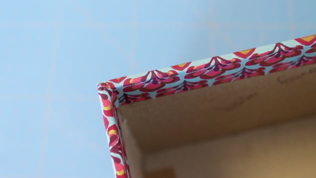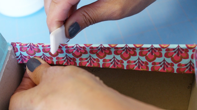 Là encore il est préférable d’avoir une bande de papier assez longue pour pouvoir faire tout le tour de la boîte sans raccord. La bande de papier doit dépasser de 2 cm sur le fond extérieur du couvercle et doit pouvoir se rabattre totalement sur les côtés intérieurs du couvercle, comme sur les images ci-dessus. Pour rabattre le papier vers l’intérieur du couvercle, coupez le papier en appuyant la lame du cutter sur le côté perpendiculaire, arrêtez-vous à l’épaisseur du carton puis coupez ce qu’il reste en biais. Cela vous permettra de rabattre sans que le carton n’apparaissent dans les angles et sans avoir trop de sur-épaisseur de papier qui pourrait gêner la fermeture de la boîte. Faites de même pour tous les angles. Encollez et rabattez. Marquez bien les arrêtes à l’aide de l’encoche du plioir, vous obtiendrez un résultat bien net.