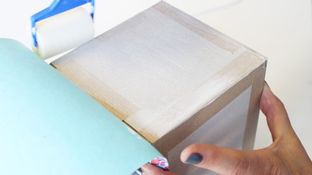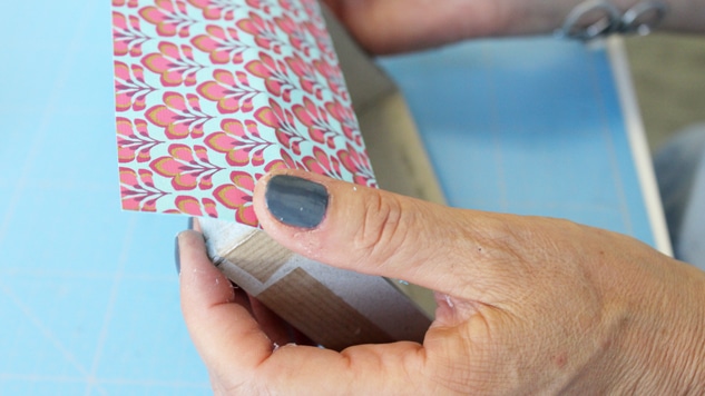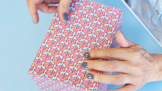 Nous allons maintenant passer à l’habillage. Faites en sorte d’avoir une bande papier assez longue pour pouvoir faire tout le tour de votre boîte sans raccord. Ce sera plus joli et plus facile ! 🙂 Votre papier doit également dépasser d’au moins 2 bons cm en haut et en bas de la boîte afin de pouvoir le rabattre. Encollez les côtés avec de la flexicolle au fur et à mesure et lissez bien à l’aide d’un plioir afin de chasser les éventuelles bulles d’air.