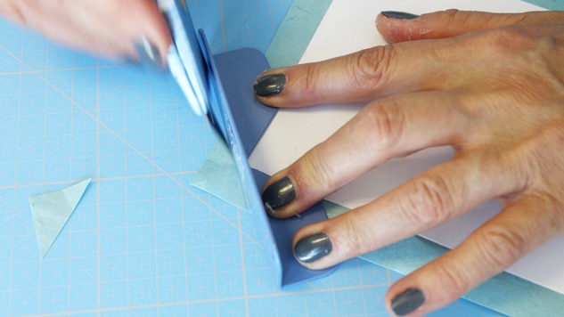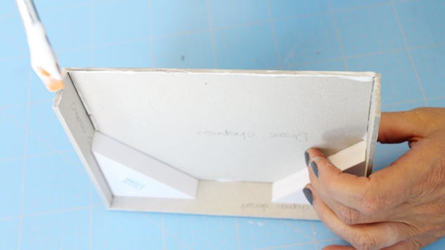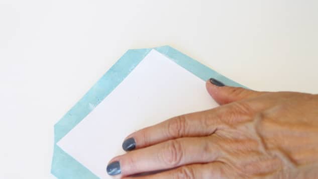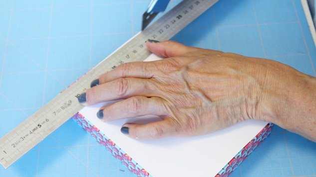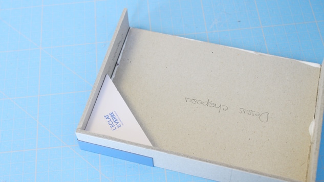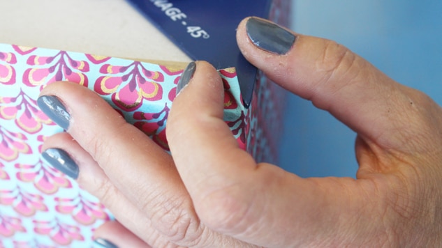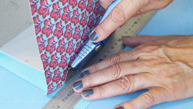 Pour rabattre le papier sur le fond de la boîte nous allons nous aider du gabarit d’angle 45°. Marquez l’arrête avec un plioir, puis pincez les angles comme sur la photo ci-dessus. Placez votre gabarit d’angle 45° contre le pli et coupez. Faites de même pour tous les coins. Encollez et rabattez proprement le papier sur le fond.