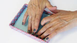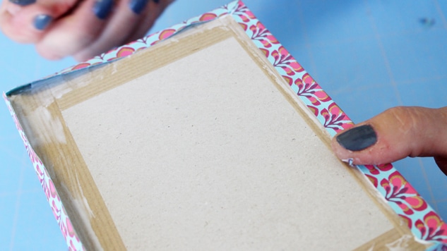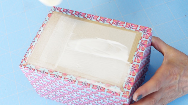 Pour habiller le fond intérieur du couvercle, c’est presque pareil que pour la boîte sauf que nous allons rabattre et encoller la marge du papier sur l’envers du Rigidex puisque les côtés du couvercle sont déjà habillés. Encollez directement le Rigidex pour ne pas tâche l’intérieur du couvercle.