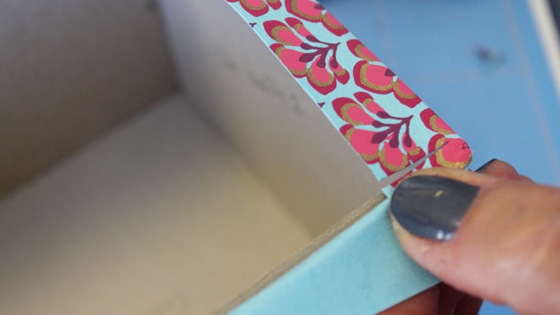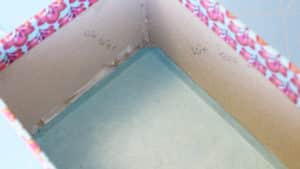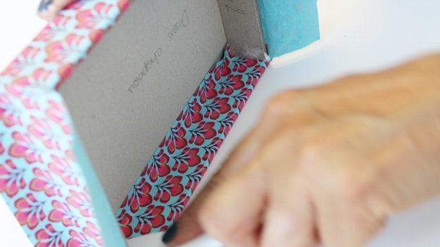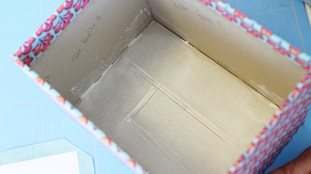 Pour terminer nous allons confectionner les rebords intérieur de la boîte qui permettront l’emboîtement avec le couvercle. Recouvrez la cartonnette déjà découpée avec le papier choisi pour l’habillage intérieur de la boîte. Puis encollez les cartonnettes et placez-les une par une à l’intérieur de la boîte. Vous pouvez utiliser une mini-masse pour vous assurer que la colle prenne bien.