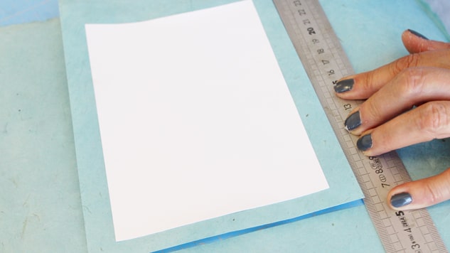 Passons à l’habillage du fond intérieur de la boîte. Découpez un morceau de Rigidex 250 g de 17 x 12 cm, puis encollez-le et collez-le sur le papier choisi pour habiller l’intérieur de la boîte. Laissez le papier dépasser de 2 cm tout autour du Rigidex. À l’aide du gabarit de précision coupez les angles du papier. Marquez les plis du papier rabattant ce qui dépasse sur l’endroit du Rigidex.