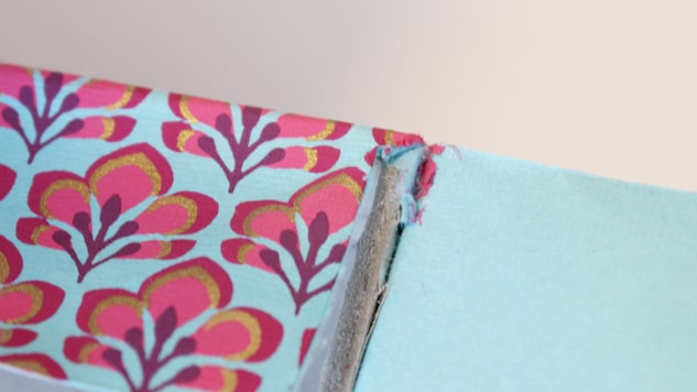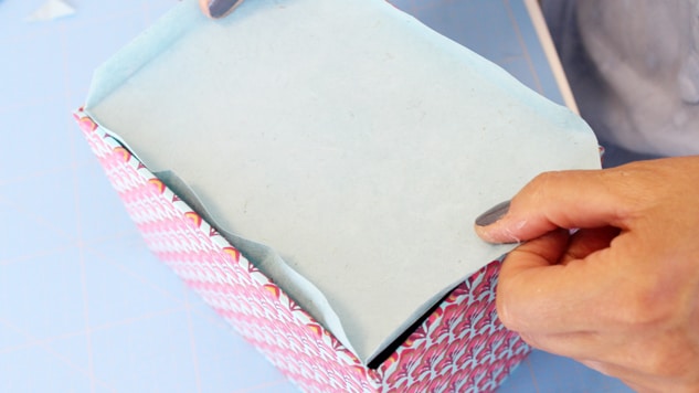 Pour le fond extérieur, découpez un morceau de papier (de préférence le même que celui utilisé pour l’extérieur) de 17 x 12. Le papier ne doit pas dépasser du fond et ne doit pas laisser apparaître le carton. Puis encollez le fond et placez votre papier. Lissez avec un ploir.