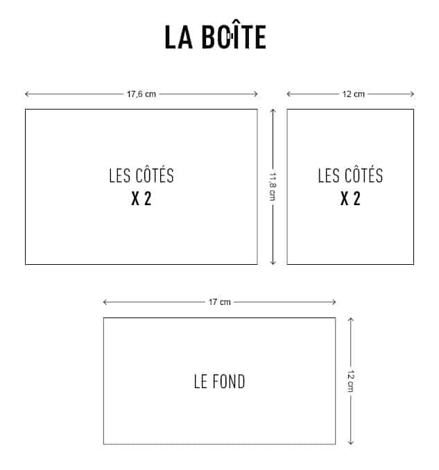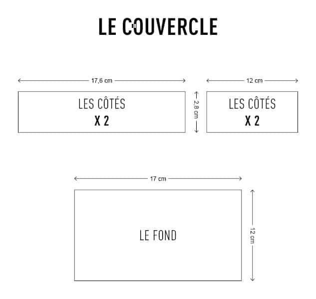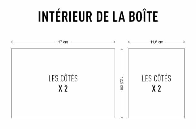 Commencez par découper dans du carton gris de 3mm les éléments du couvercle et de la boîte selon les gabarits ci-dessus et dans du carton 1,5 mm les éléments pour l’intérieur de la boîte. Si vous souhaitez personnaliser les dimensions, n’oubliez pas de prendre en compte l’épaisseur de votre carton. Une fois tous les éléments découpés vérifiez qu’ils soient tous d’équerre pour éviter les mauvaises surprises à l’assemblage.