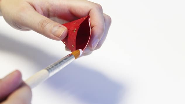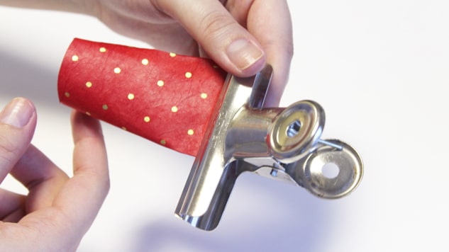 Puis collez l’une des ouvertures restantes. Vous pouvez utiliser une pince à dessin pour maintenir l’ouvrage et permettre à la colle de prendre.
