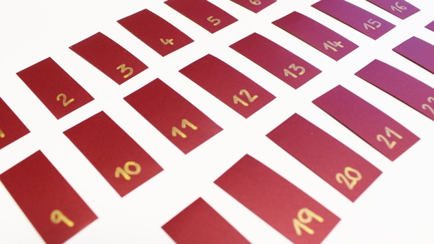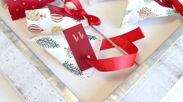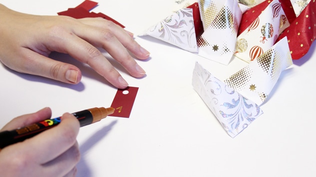 Vous pouvez les numéroter en utilisant une bande de papier contrastante ou en écrivant directement dessus à l’aide d’un feutre. Percez un trou à l’aide d’une perforatrice afin d’y glisser le ruban qui permettra d’accrocher les berlingots au cadre.