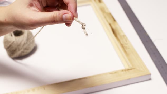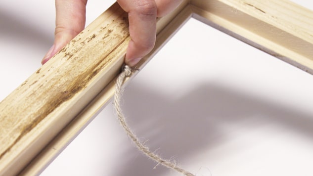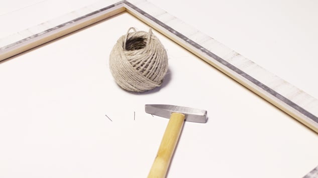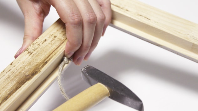 Pour accrocher les berlingots, tendez trois fils de chanvre à l’intérieur du cadre. Pour cela coupez des morceaux de la même largeur que le cadre et faites des doubles nœuds bien serrés à chaque extrémité. Puis à l’aide d’un petit clou fixez la corde au cadre. Laissez suffisamment d’espace entre chaque corde pour la hauteur des berlingots.