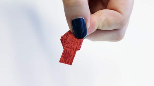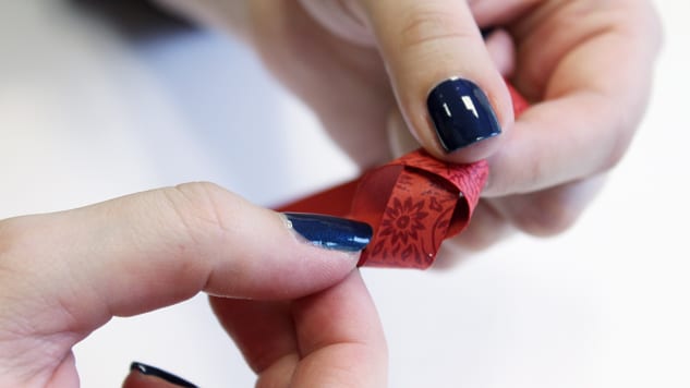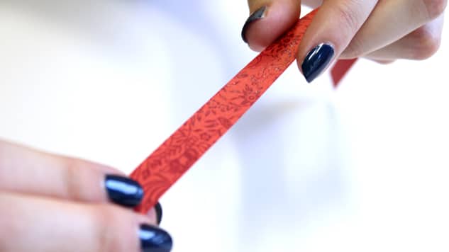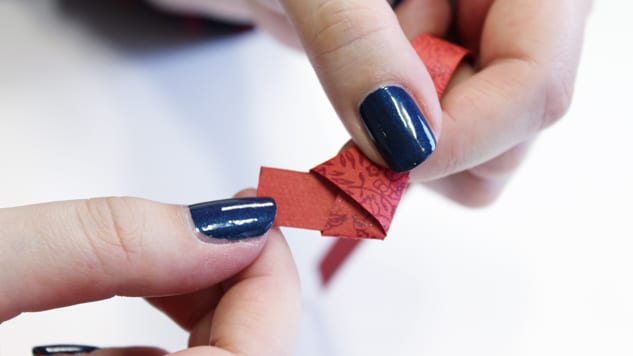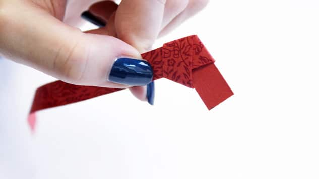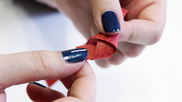 Découpez plusieurs bandes de 1 x 25 cm dans un ou plusieurs papiers de votre choix (ici, vous pouvez privilégier les papiers népalais, indiens et italiens, qui seront plus facile à travailler). Commencez par nouer le papier, marquez bien les plis.