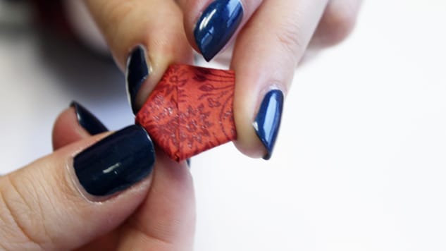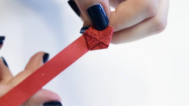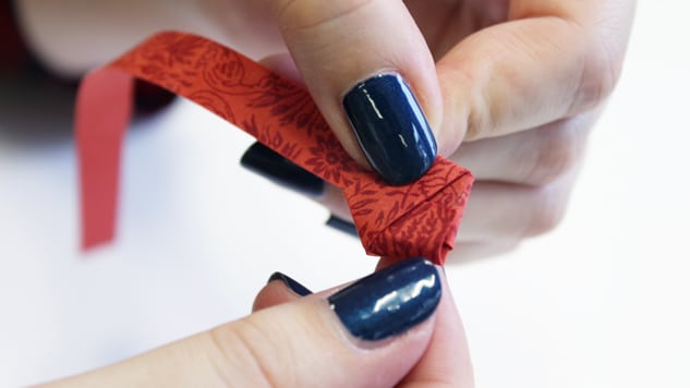 Rabattez la bande sur elle-même en suivant bien les angles du pentagone, la bande se placera d’elle-même. Puis, comme au début, rentrez la fin de la bande à l’intérieur d’un pli.