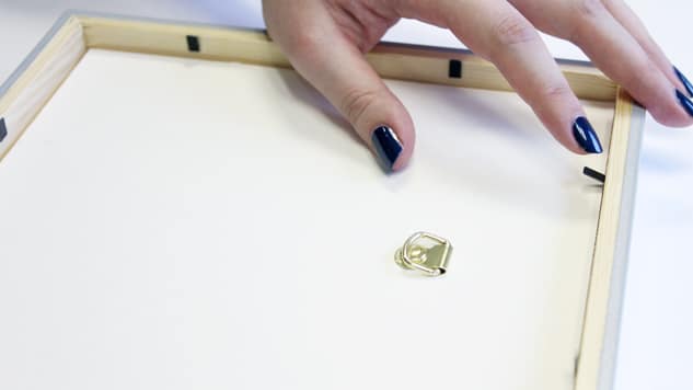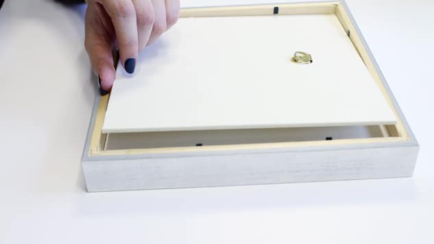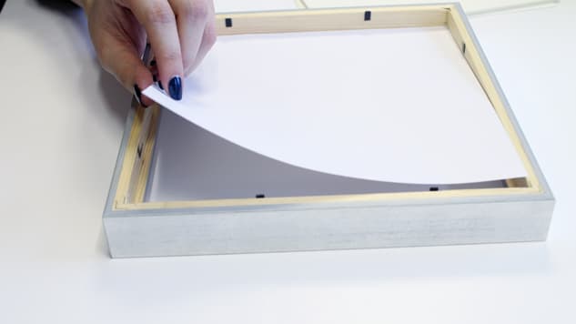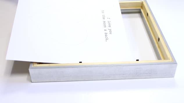 Placez la feuille avec votre texte ou forme à l’intérieur du cadre, puis le carton de fond avec l’attache. Fixez l’ensemble grâce aux petites languettes métallique ou à l’aide de petits clous.