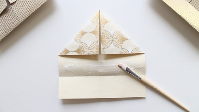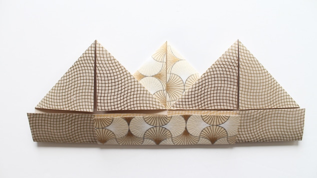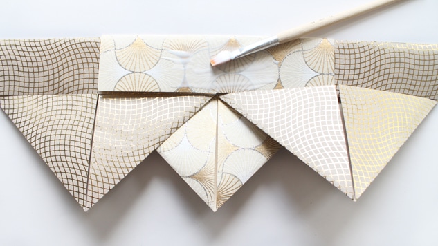 Retournez votre pliage et encollez l’arrière des triangles pour que l’ensemble se tienne. Mettez sous presse quelques instant pour que la colle prenne. Notre couronne est presque finie ! 👑 😉