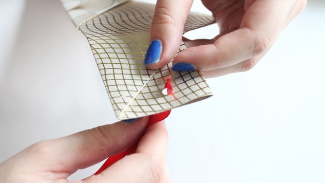 Percez les deux extrémités à l’aide d’une poinçonneuse ou simplement d’une aiguille (attention pas trop près des bords, surtout si votre papier est fin, pour éviter qu’il ne se déchire). Puis passez un ruban ou un morceau de fil de chanvre dans les deux trous afin de créer une attache réglable.