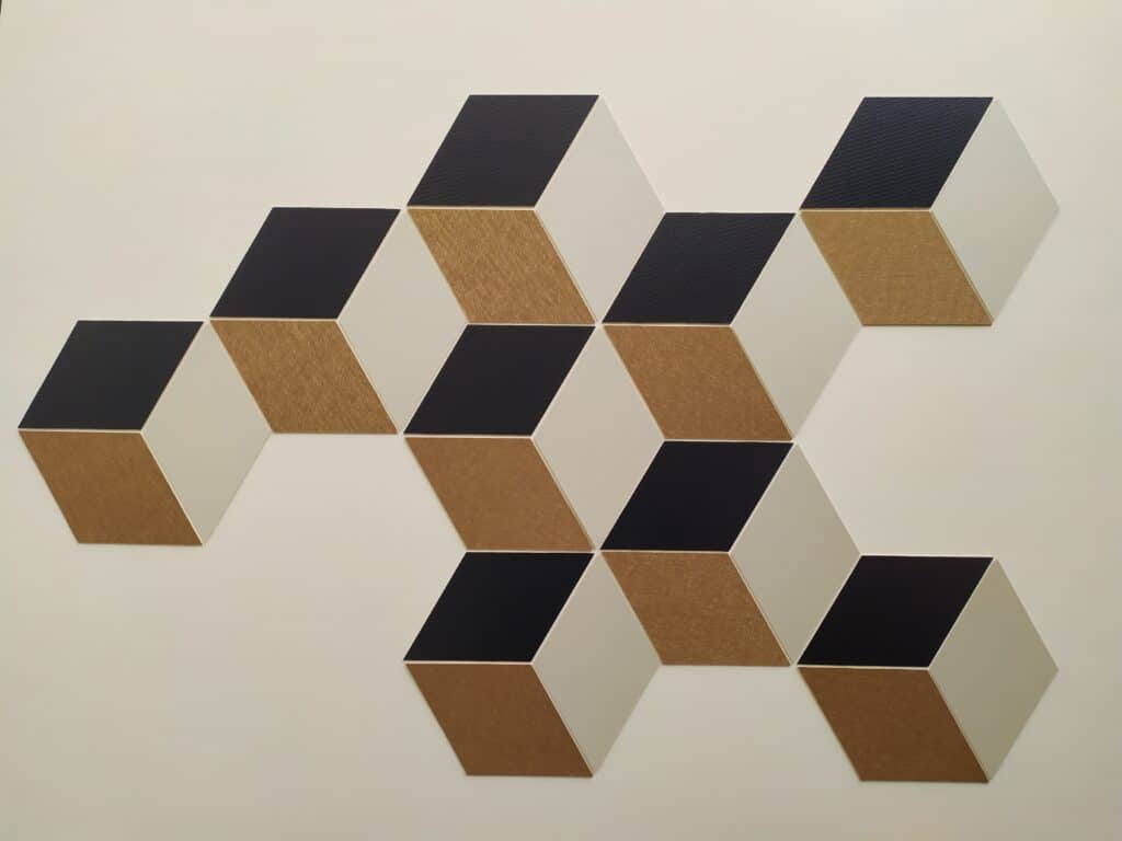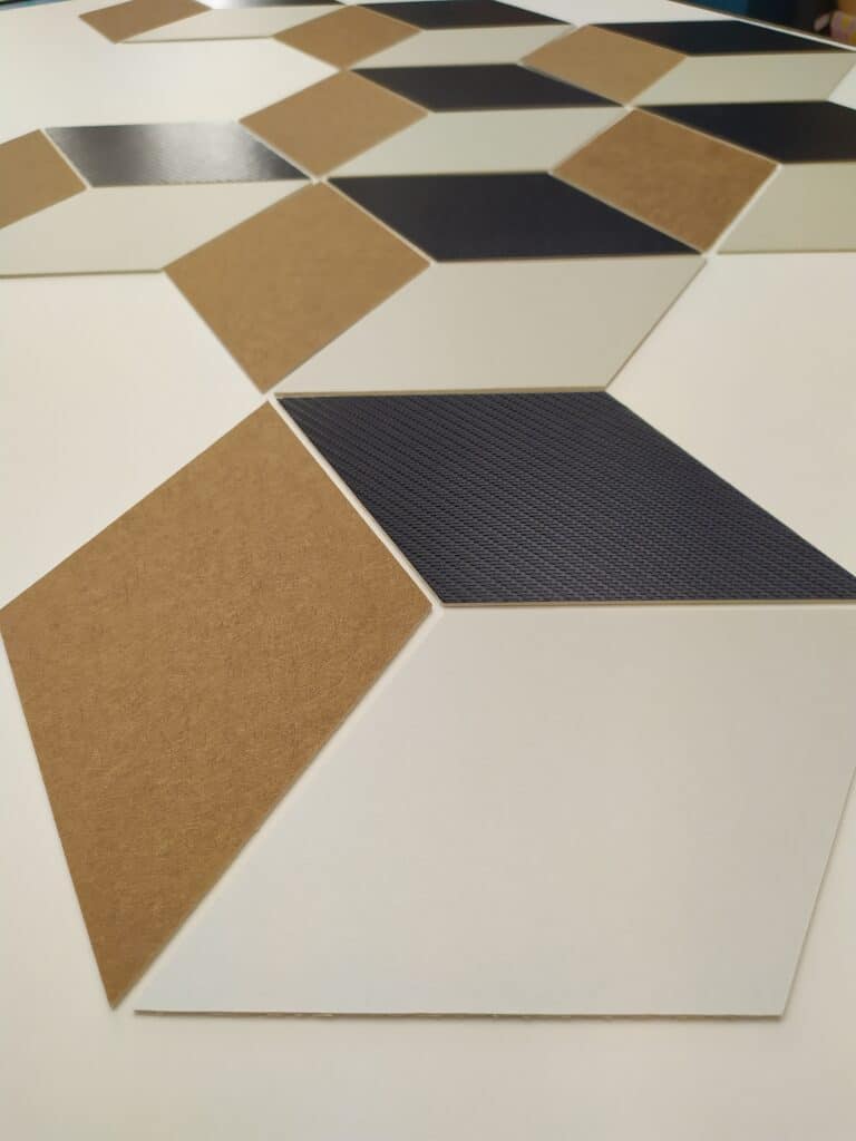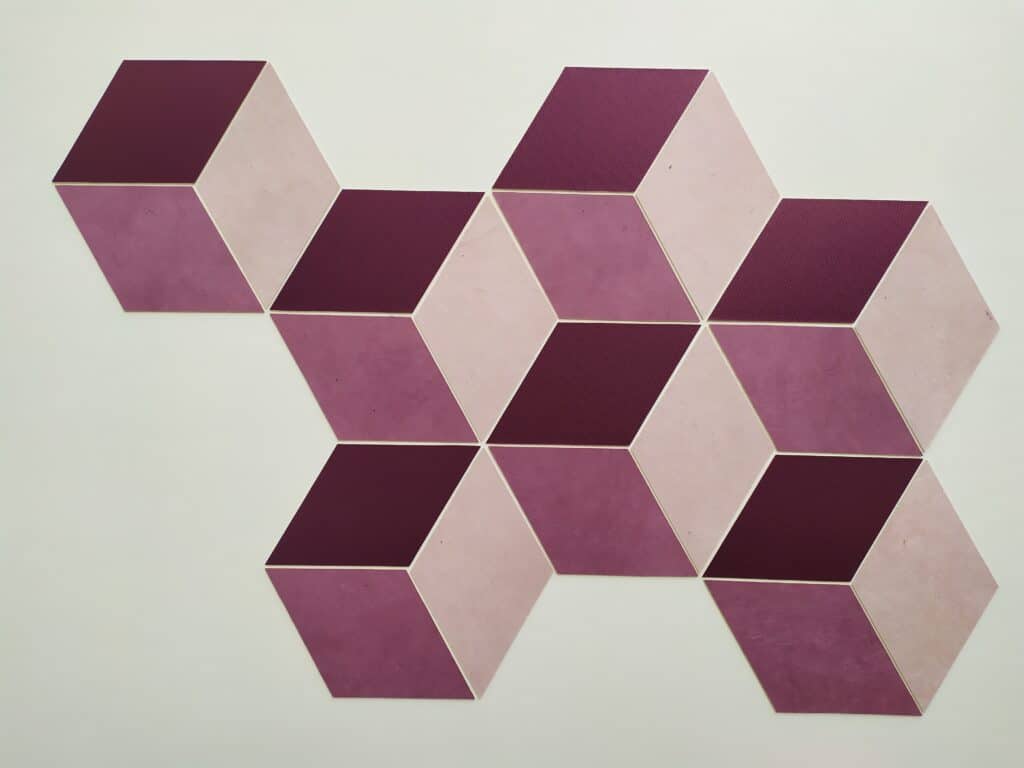 Répétez l’opération jusqu’à obtenir le nombre de cubes désiré. Collez votre papier sur les losanges à l’aide de colle ou directement sur le cartfix en enlevant la pellicule. Passez le pavé de lissage et coupez le surplus de papier ou bien rembordez-le.