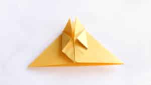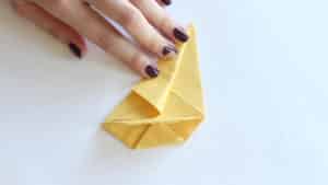 Rabattez les pointes extérieurs vers l’intérieurs, elles doivent rejoindre les deux autres pointes. Puis nous allons faire rentrer ces deux pointes extérieurs, que nous avons déjà pliés deux fois, à l’intérieur des deux triangles (voir la photo ci-dessus). Cette étape nous permet de former la base de notre poule.