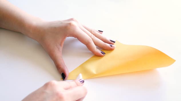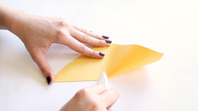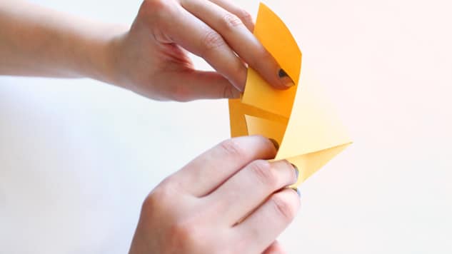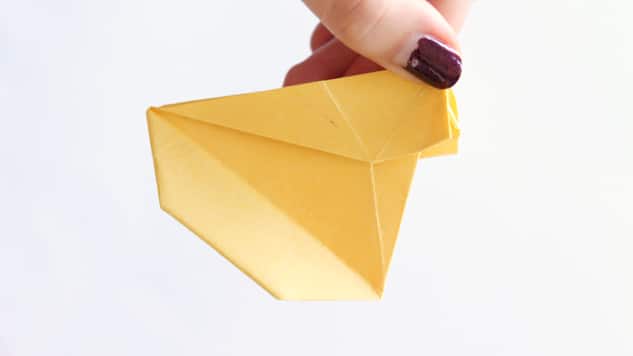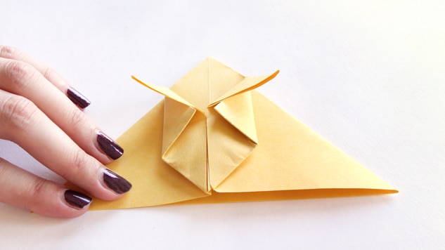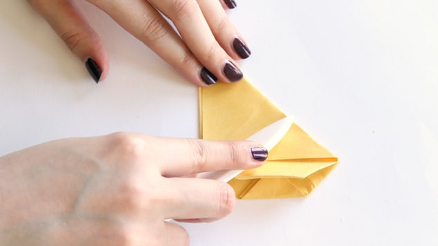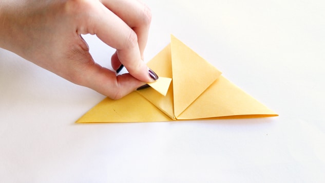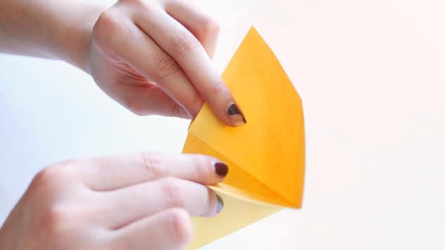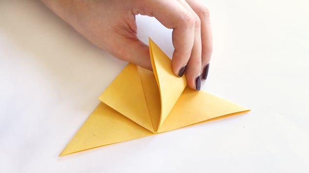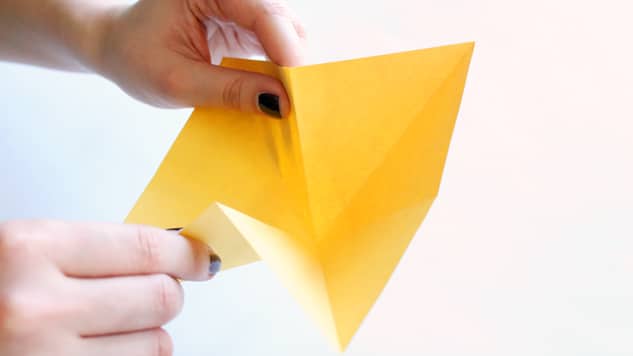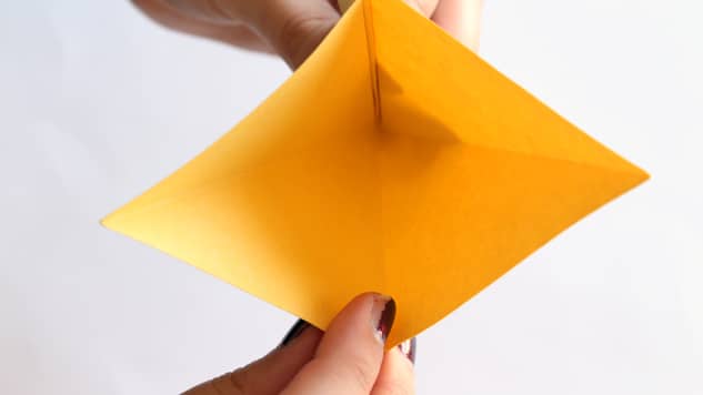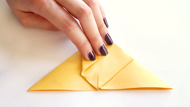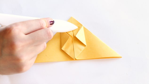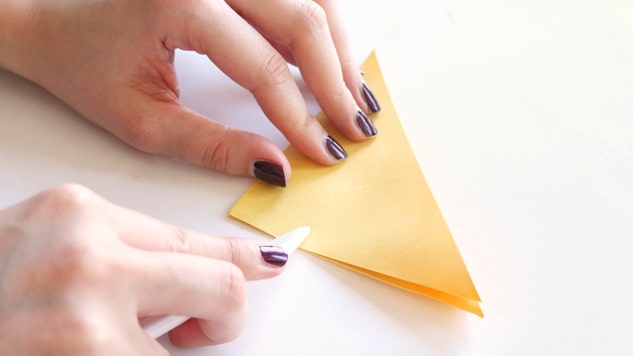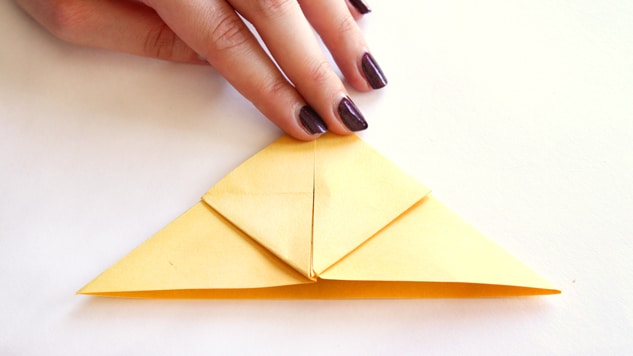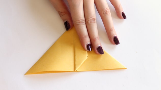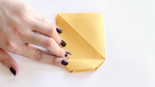 Pliez la pointe supérieure du triangle en vous aidant de la diagonale qui part du coin perpendiculaire. Dépliez, refaites la même chose de l’autre côté et dépliez de nouveau.