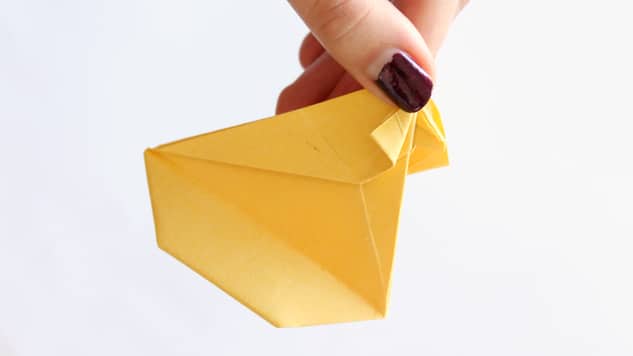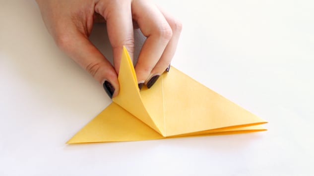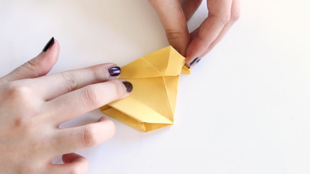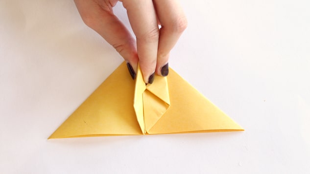 Rabattez les pointes extérieurs vers l’intérieurs, elles doivent rejoindre les deux autres pointes. Puis nous allons faire rentrer ces deux pointes extérieurs, que nous avons déjà pliés deux fois, à l’intérieur des deux triangles (voir la photo ci-dessus). Cette étape nous permet de former la base de notre poule.