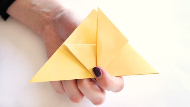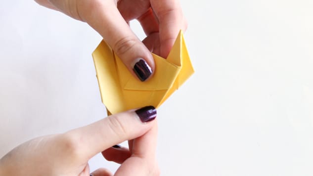 Cette partie est un peu délicate, prenez votre temps. Il s’agit d’ouvrir et de plier dans l’autre sens cette partie (la pointe vers le haut, voir le premier pli de l’étape 9).