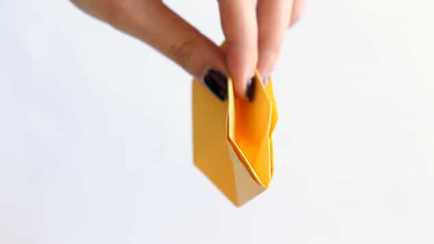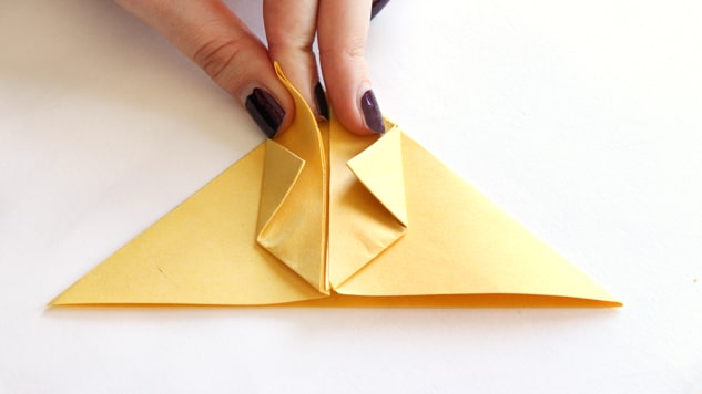 Puis repliez les deux côtés opposés vers l’intérieurs (comme sur les photos ci-dessus), pour obtenir une forme triangle. Marquez bien les plis.