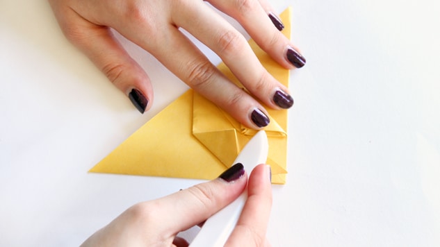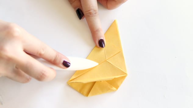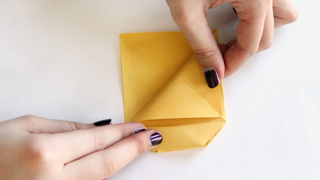 Pliez les deux pointes supérieurs en vous aidant des deux plis précédents. Puis dépliez.