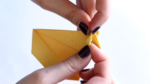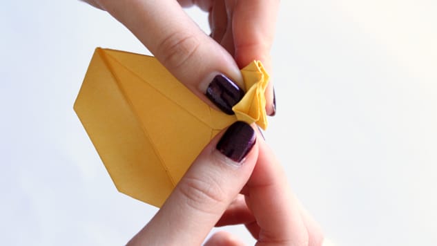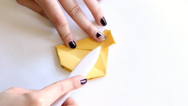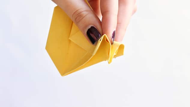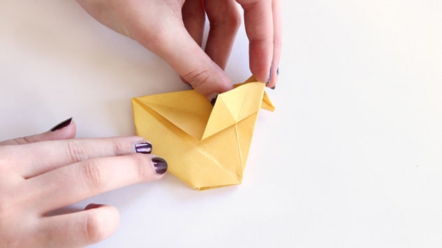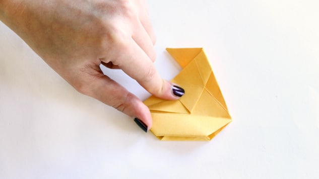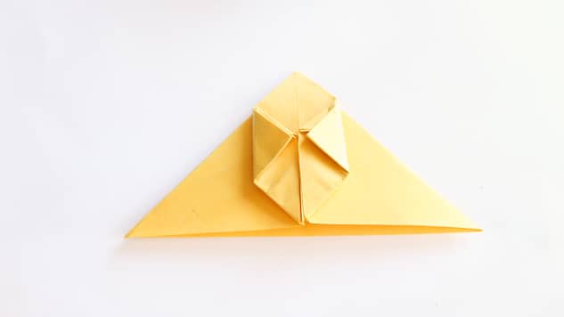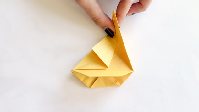 Nous allons formez la tête de la poule en rentrant le pli extérieur vers l’intérieur. Il s’agit de le replier sur lui-même.