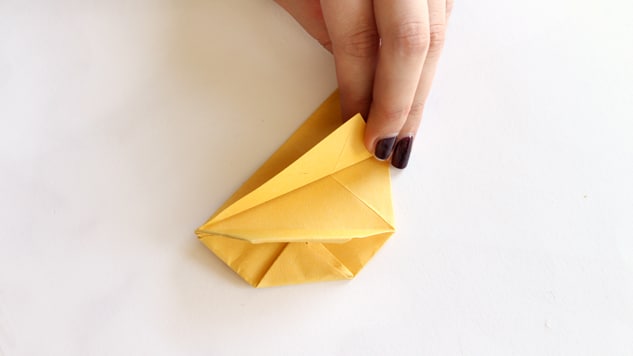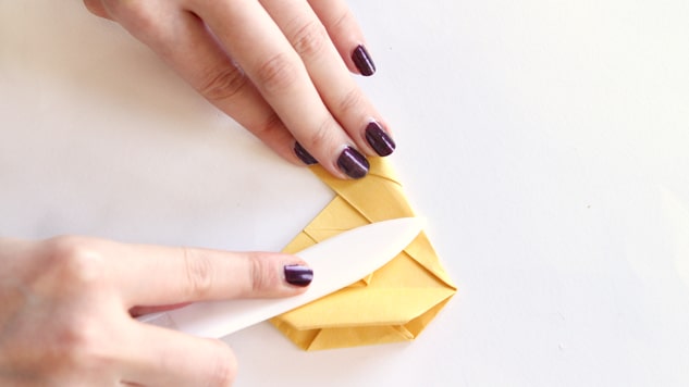 Pliez la partie qui dépasse. Marquez bien le pli. Ouvrez et divisez en deux le dernier pli, puis rabattez ce qui dépasse à l’intérieur. Faites de même de l’autre côté.