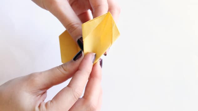 Puis, sur une face uniquement, rabattez les coins extérieurs du triangle vers le sommet de ce dernier en vous aidant du pli central. Vous obtenez un losange.