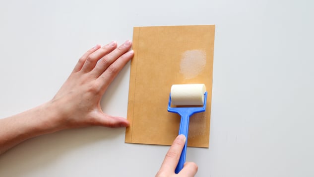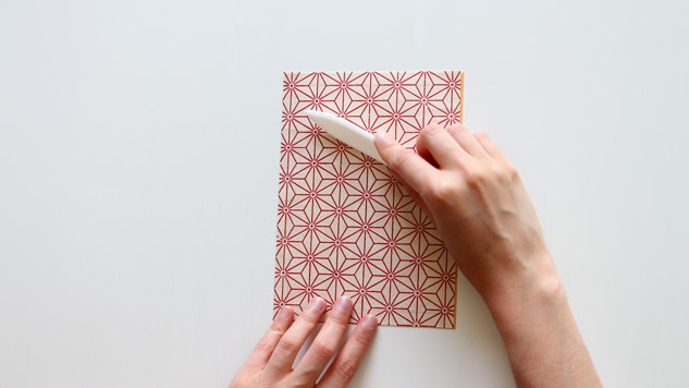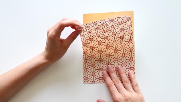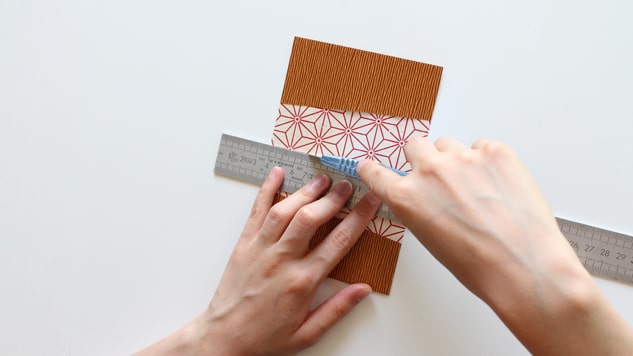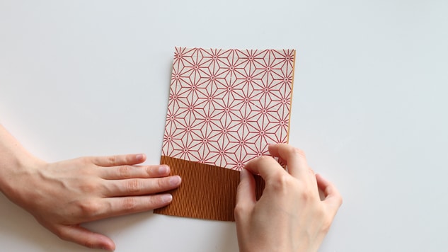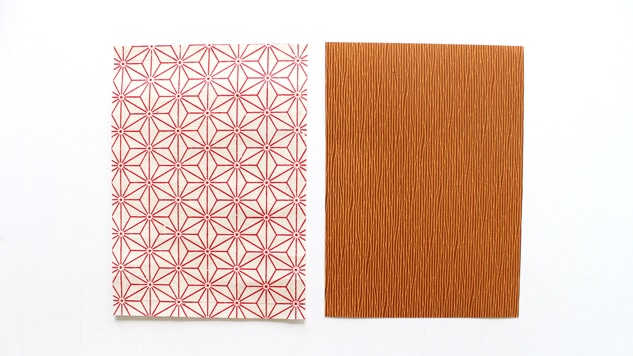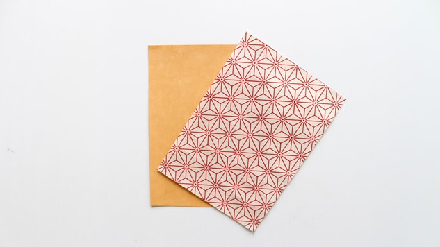 Encollez le papier Rayure marron à l’aide d’un rouleau mousse pour bien répartir la colle et collez le papier Sashiko envers sur envers. Si les deux papiers ne se superposent pas parfaitement, ce n’est pas grave nous avons prévu des marges pour un fini parfait ! 😉