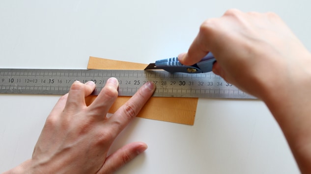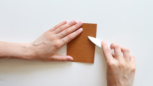 C’est presque fini ! Marquez le pli du porte-cartes à l’aide d’un cutter (surtout n’appuyez pas, il s’agit seulement de casser la fibre du papier pour faciliter le pliage). Pliez à l’aide du plioir !