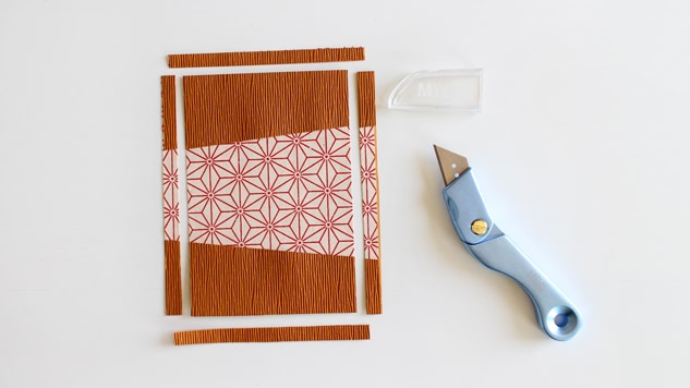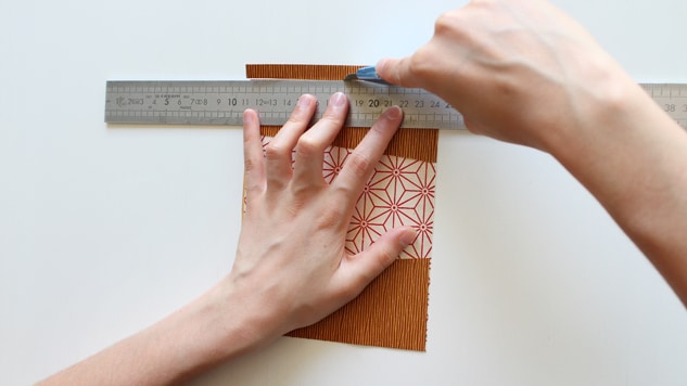 Commencez par découper un rectangle de 18×13 cm dans le papier Rayure marron puis deux petits rectangles de 6×13 cm qui nous serviront pour créer les poches. Ensuite découpez un autre rectangle de 18×13 cm dans le papier Sashiko qui nous servira pour habiller l’intérieur de notre porte-cartes.