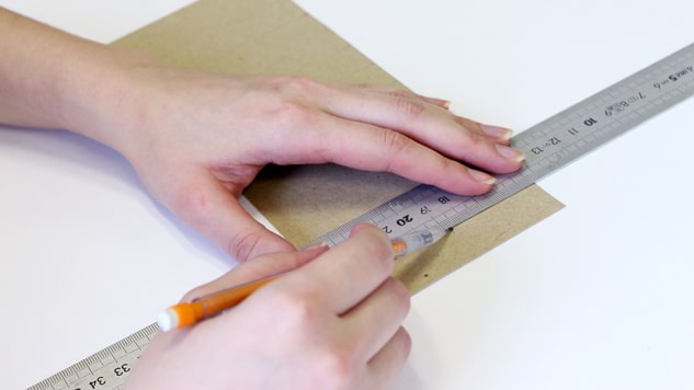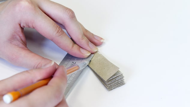 Tracez des repères tous les 2 cm. La dernière bande doit faire 1 cm, elle nous servira à raccorder les 3 bandes entre elles. Marquez les plis avec avec un plioir ou en appuyant très légèrement avec la lame d’un cutter (il s’agit juste de casser la fibre du papier pour faciliter le pliage, pas de couper).