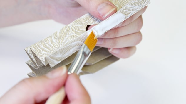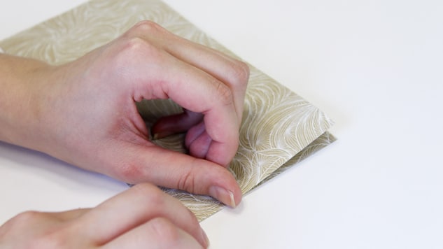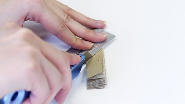 Pour créer un motif dans les pétales de votre rosace, tracez une demi- forme sur le bord de la bande d’accordéon replié en prenant soin de placer la découpe sur un pli entrant et non sortant (comme sur la photo ci-dessus). Pour obtenir un rond ou un losange une fois la rosace dépliée, tracez un demi- cercle ou un demi- losange. Coupez à l’aide d’un cutter (il faudra peut-être repasser plusieurs fois pour couper toutes les épaisseurs de papier).