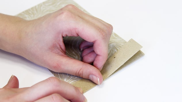 Raccordez les 3 bandes en encollant la plus petite bande de l’accordéon et en veillant à ce que tous les plis coïncident une fois assemblés. Attention, ne fermez pas encore votre rosace, il s’agit uniquement d’assembler les 3 bandes pour obtenir une seule grande bande.