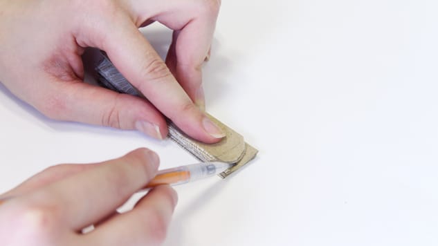 Fermez la rosace en collant la première et la dernière bande (ici, il faudra peut-être couper une bande pour que les plis coïncident).