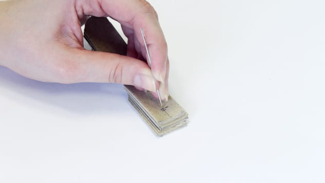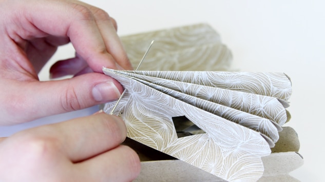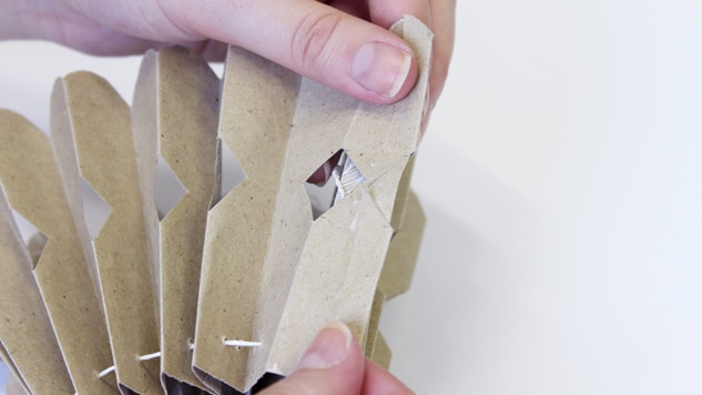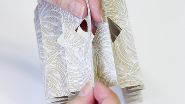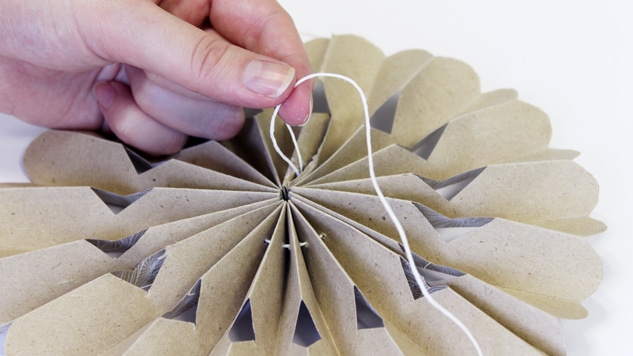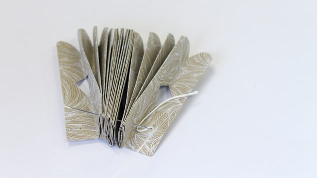 Repliez la totalité de l’accordéon pour obtenir une seule bande très épaisse. Puis à l’aide d’une pointe et d’un marteau percez un trou à environ 1 cm du bord inférieur. Faites passer un morceau de fil épais en veillant à ne pas le faire passer dans la première et la dernière bande (voir photo ci-dessus).