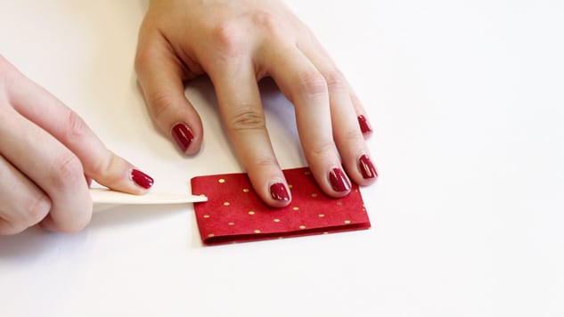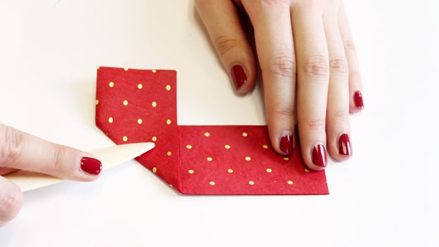 Rabattez les quatre coins vers l’intérieur comme sur la photo ci-dessus. Marquez bien les plis à l’aide du plioir pour que le pliage final tienne.