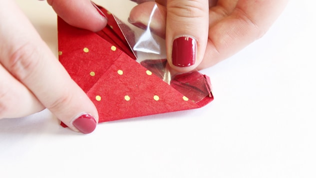 Dépliez le dernier pli (de la même manière que sur la photo ci-dessus). Rabattez les extrémités vers l’intérieur en vous aidant du pli central précédemment marqué.