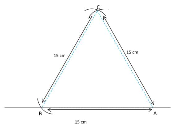 Tracer un triangle équilatéral de 15 cm de côté sur le carton gris : Tracez une droite. Nommez un point A. Ouvrez votre compas à 15 cm, et pointez le compas sur le point A. Tracez 2 arcs de cercle de cercle sur la droite. A l’intersection, nommez le point B. En partant de A, puis de B, tracez le point C.