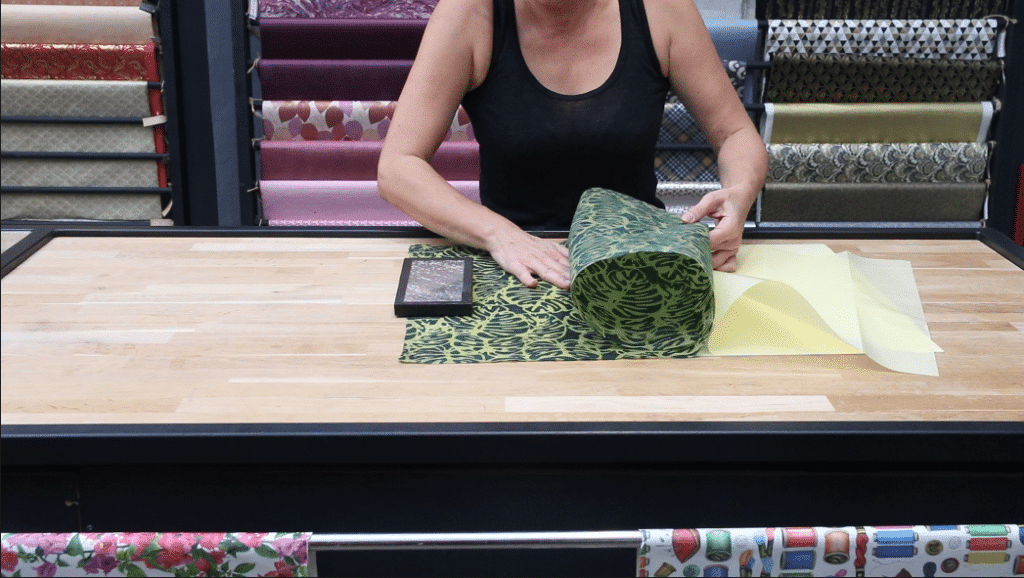 3. Mettre la pellicule carfix sur le papier fantaisie et faire glisser le pavé de lissage de haut en bas pour enlever les bulles éventuelles.
