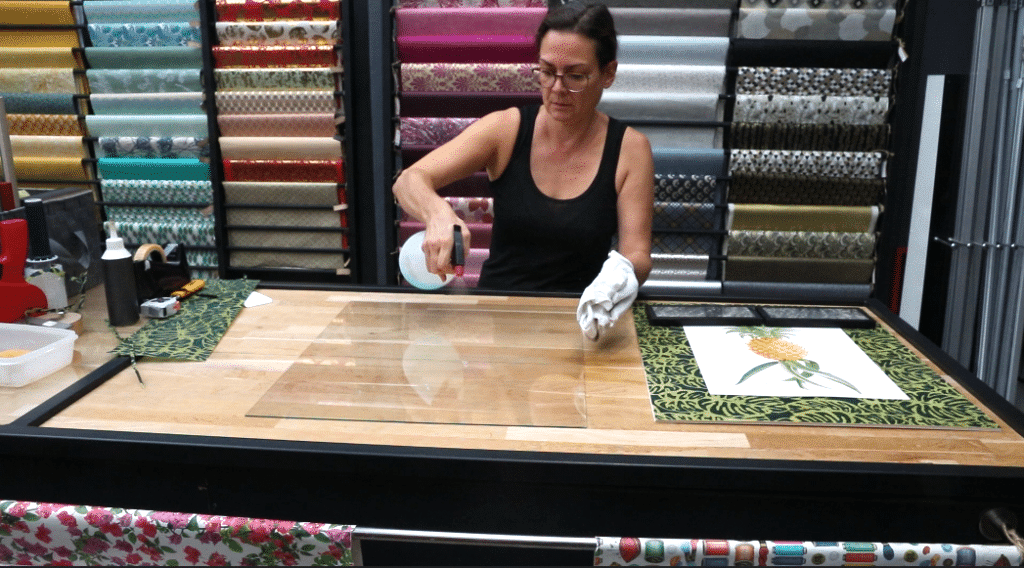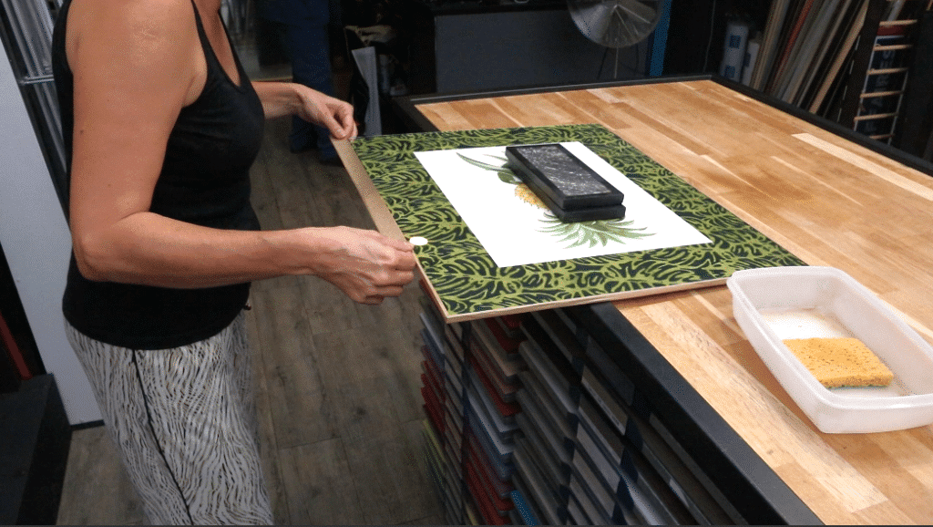 9. Déposer le verre sur le papier fantaisie collé au carfix et au carton de fond. Poser une masse lourde sur le verre pour éviter les mouvements.