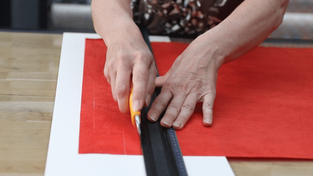 5. Coupez 4 bandes de 2 cm de largeur dans le papier népalais rouge.