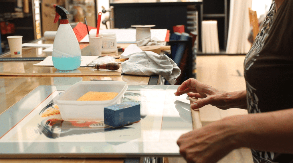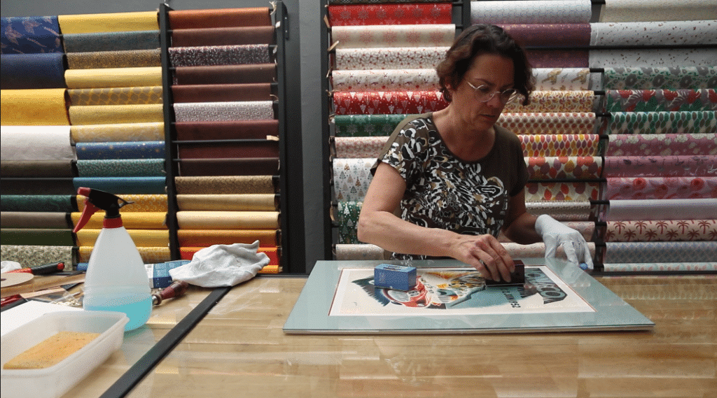 19. Humidifier les bandes sur une éponge mouillée afin de procéder au kraftage. L’objectif de cette étape est de solidariser l’ensemble des supports, le verre, le papier, l’affiche et le carton de fond. Placer les bandes à environ 2mm de largeur sur le verre. Coller ensuite les bandes sur les 4 côtés du cadre, sur la tranche et sur l’arrière en pressant bien.