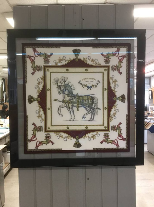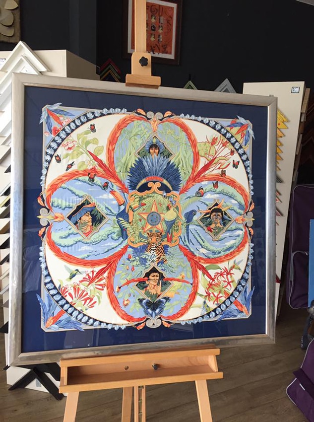 À gauche : Foulard encadré ; À droite : encadrement d’un foulard Hermès avec bords roulottés apparents entre deux verres