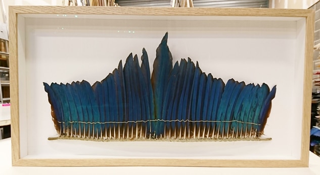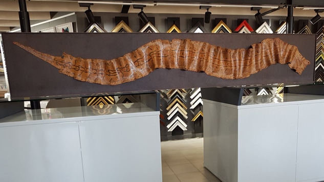 À gauche : encadrement d’une peau de python de 3,80 m ; À droite : Cadre contenant une coiffe de plumes