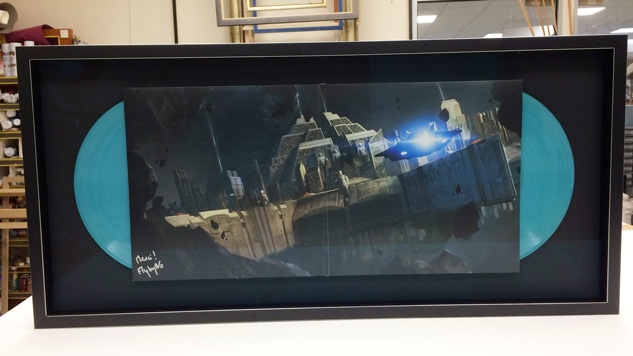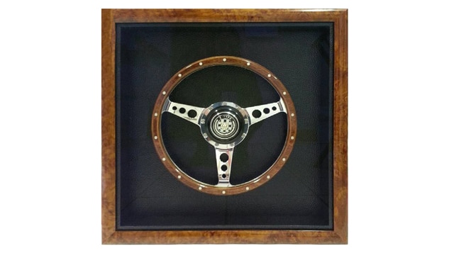 À gauche : encadrement d’un double album vinyle ; À droite : Encadrement d’un volant de voiture de sport