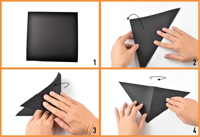 3-4 Pliez le triangle obtenu en 2 puis réouvrez-le et retournez-le, pointe vers le bas.